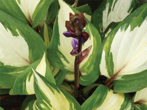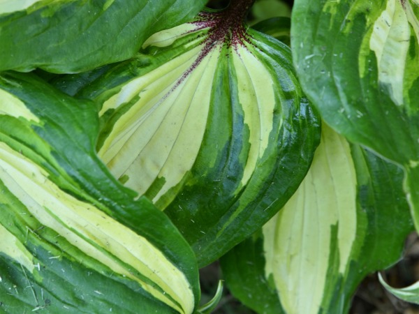 Funkia RASPBERRY SUNDAE to niska, kępiasta odmiana osiągająca 25 cm wysokości (60 cm w trakcie kwitnienia) i 50 cm szerokości. Tworzy krótkie podziemne rozłogi, z których wiosną wyrastają podłużne, sercowate liście. Są lekko pofałdowane, koloru kremowego z zielonym obrzeżem. Znakiem rozpoznawczym tej odmiany są czerwono-bordowe łodygi, odznaczające się wyraziście na tle jasnych liści.