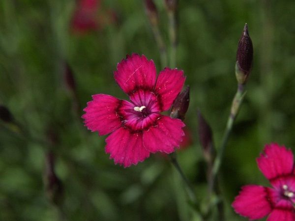 Bylina wieloletnia, tworząca gęstą darń o wysokości ok. 20 cm. Pokój kobiercowaty w postaci luźnych poduszek. Liście wąskolancetowate, ułożone naprzeciwlegle, ciemnozielone. Kwiaty jaskrawo karminowe, o ząbkowanych płatach, zebrane w luźne kwiatostany, bardzo dekoracyjne. Kwitnie obficie od czerwca do września. Bylina łatwa w uprawie.