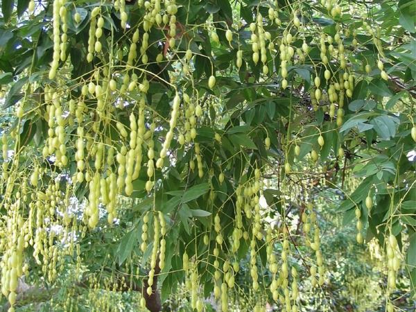 Kwiaty zebrane w luźne wiechy na pędach szczytowych do 30 cm długości. Kredowobiałe, obupłciowe. Kształtem i wielkością przypominają kwiaty robinii akacjowej.Owocem są zielone mięsiste strąki, przewężone między nasionami, w przekroju okrągłe do 8 cm długości, 3-6 czarnych nasion w strąku. Na mróz jest wytrzymały, zwłaszcza drzewa starsze.