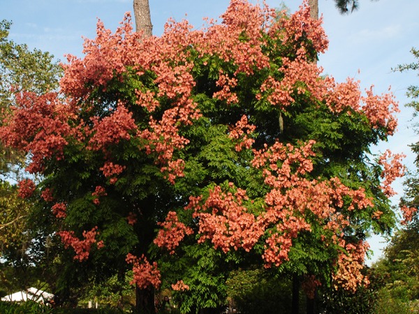 Liście sezonowe, długości do 35 centymetrów, składające się z 7-15 podłużnie-jajowatych listków długości 3-8 centymetrów, barwy ciemnozielonej, natomiast młode listki barwy jaskrawoczerwonej; jesienią liście przebarwiają się na pomarańczowo lub pomarańczowo-brązowo. Owoce długo utrzymują się na gałązkach, są bardzo dekoracyjne.