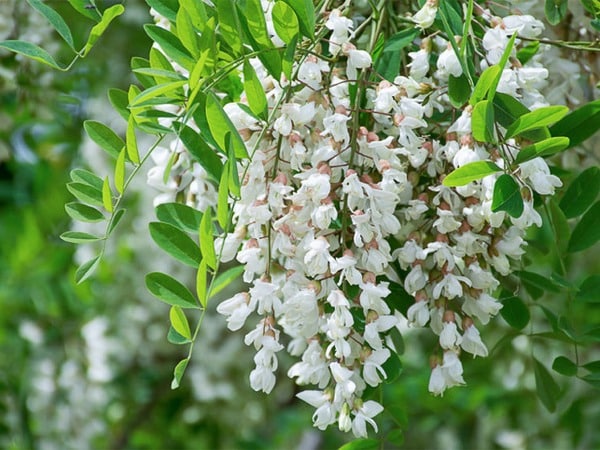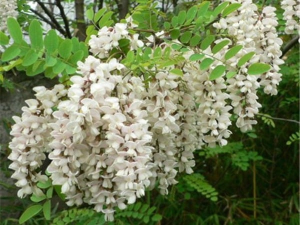 Kwiaty motylkowe, białe z żółtą plamką silnie pachnące i tworzące grona długości 10-20 cm. Robinia należy do naszych najbardziej miododajnych roślin, lecz nektaruje obficie tylko w okresie ciepłej, prawie upalnej pogody. W czasie chłodów płatki są bardziej sztywne i pszczołom trudno jest wtedy odginać żagielek aby dostać się do nektaru.