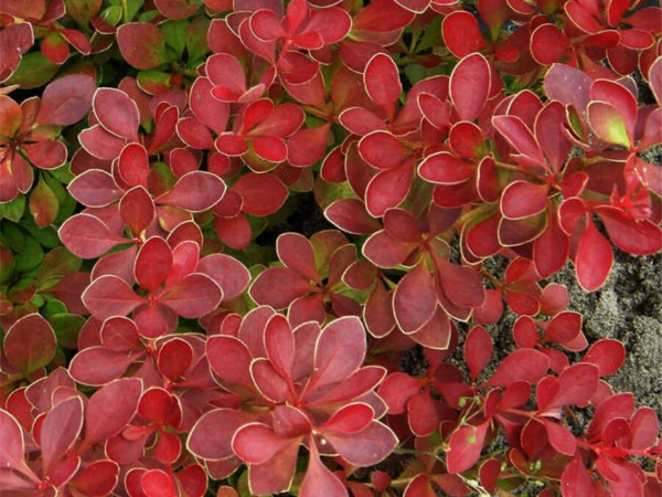 Berberys thunberga RED CARPET to gęsty, kolczasty krzew o czerwonych liściach, dorastający do 1 metra wysokości. Niski krzew o pokroju krzaczasto rozłożystym. Liście czerwone, wewnątrz krzewu zielonkawe, dają efekt dwubarwności, na zimę opadają. Odmiana idealna do zadarniania dużych powierzchni w przestrzeni miejskiej.
