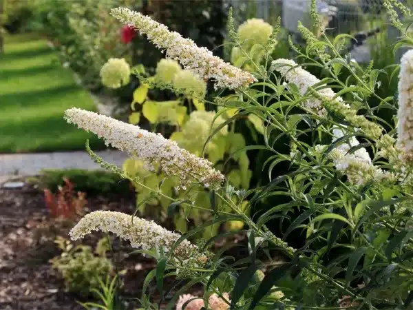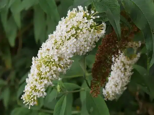 WHITE PROFUSION jest wartą polecenia odmianą o białych kwiatach i regularnym pokroju. Silnie rozgałęziony krzew o wyprostowanym pokroju. Pędy rozchylają się na boki a ich końce malowniczo przewieszają się pod ciężarem szczytowych kwiatostanów. Drobne, białe kwiaty z żółtym środkiem, zebrane są w efektowne, długie (nawet 40-centymetrowe) gęste kwiatostany, wyrastają na końcach pędów. Przypominają kwiaty lilaków. Rozwijają się stopniowo, najpierw na pędach głównych, później na bocznych. Kwitnienie trwa od końca czerwca lub początku lipca i kwitną około 7 tygodni.