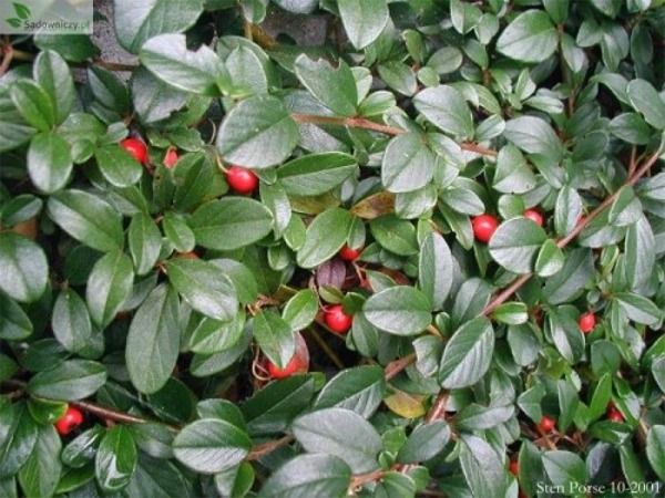 Liście eliptyczne do 1,5-3 cm długości, z podwiniętym brzegiem blaszki liściowej, młode liście skórzaste i błyszczące, dojrzałe nagie. Liście nie opadają na zimę, ciemnozielone. Owoce jaskrawoczerwone, bardzo liczne, kuliste o średnicy od 6 do 8 mm, z 4-5 orzeszkami wewnątrz. Bardzo cenna roślina okrywowa stosowana do zadarniania skarp i dużych przestrzeni.