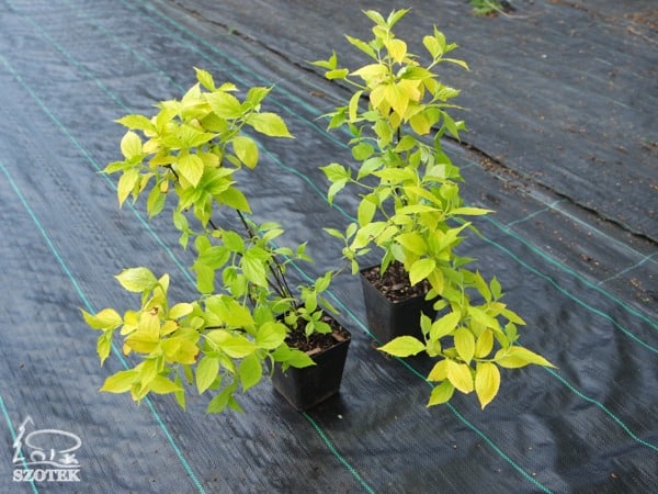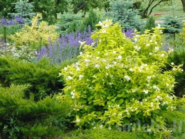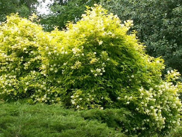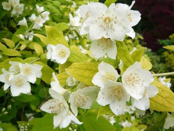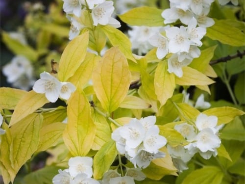 Krzew wysokości do 2 m, dość silnie rosnący, o sztywnych, wyprostowanych pędach i łukowato przewieszających się starszych gałęziach. Liście wiosną jaskrawożółte, latem zielonożółte, eliptyczne, zaostrzone, drobno ząbkowane o długości 4-8 cm. Jaśminowiec wonny Aureus kwitnie na przełomie maja i czerwca, zwykle bardzo obficie. Ma dość duże, białokremowe kwiaty złożone z 4 nagich działek kielicha, 4 płatków korony. Kwiaty mają silny, charakterystyczny, przyjemny zapach za co roślina jest tak ceniona.