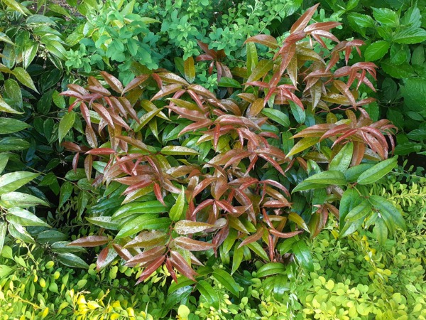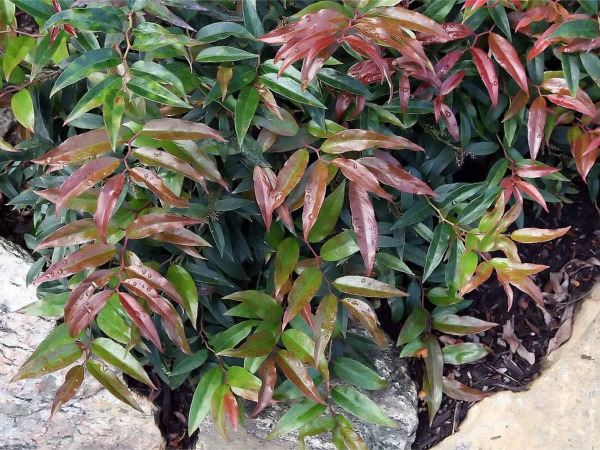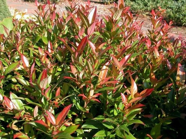 Liście podłużne, z zaostrzonym wierzchołkiem, do 8 cm długości, skórzaste, początkowo ciemnozielone, a pod koniec lata przebarwiają się pięknie na kolor winnoczerwony.
