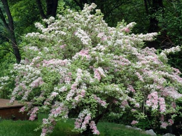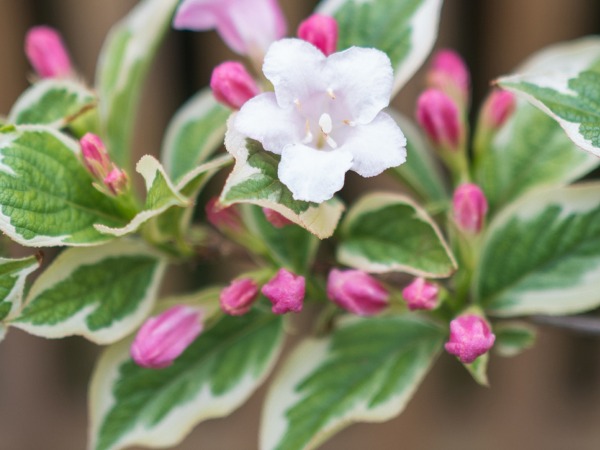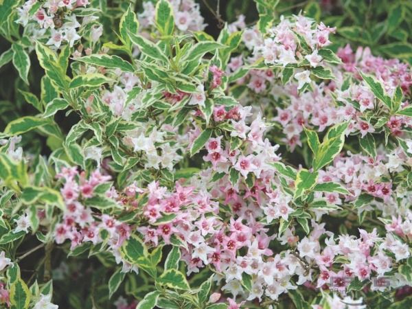 Krzewuszka cudowna NANA VARIEGATA to średniej wielkości, obficie kwitnący krzew o wyprostowanym, regularnym pokroju, z zewnętrznymi pędami rozrastającymi się na boki. Dorasta do ok. 2,5 m wysokości przy nieco większej szerokości. Liście sezonowe, szarozielone, z wąskim żółtawobiałym marginesem. Kwiaty blado różowe, 2 cm śr., dzwonkowate ze zrośniętym do połowy czerwonawym kielichem, cylindryczne, 5-krotne. Kwiaty zebrane w spore wiechy, złożone z 7-21 kwiatów, wyrastające w kątach liści, na krótkich pędach bocznych, wzdłuż zeszłorocznych gałęzi. Kwitnie w początku czerwca dość obficie powtarzając w niewielkim stopniu latem oraz jesienią w końcu września.
