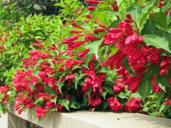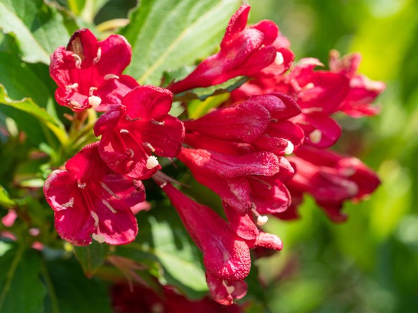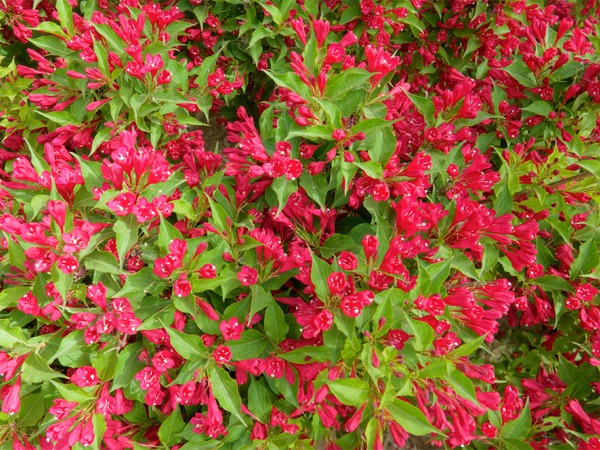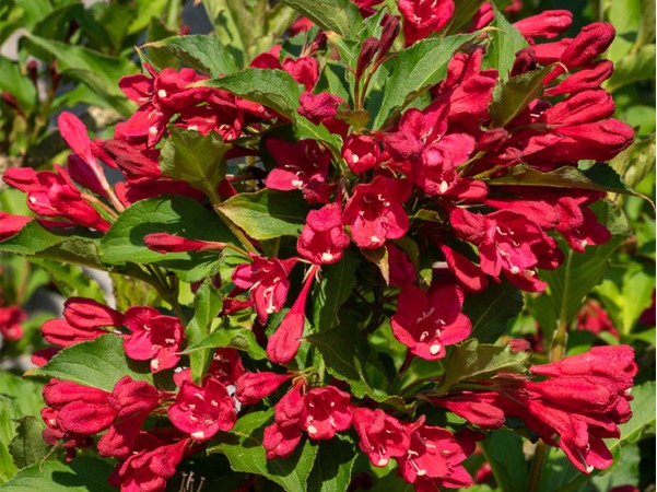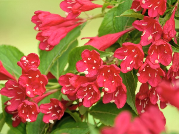 Kwiaty w kolorze soczystej czerwieni, dzwonkowate ze zrośniętym do połowy czerwonawym kielichem. Bardzo efektowna czerwona krzewuszka.