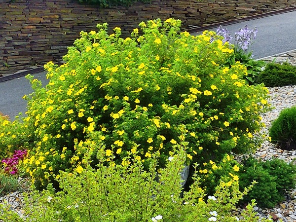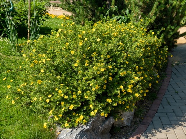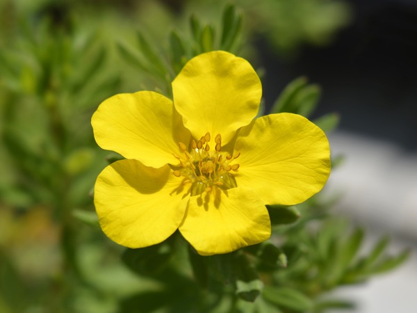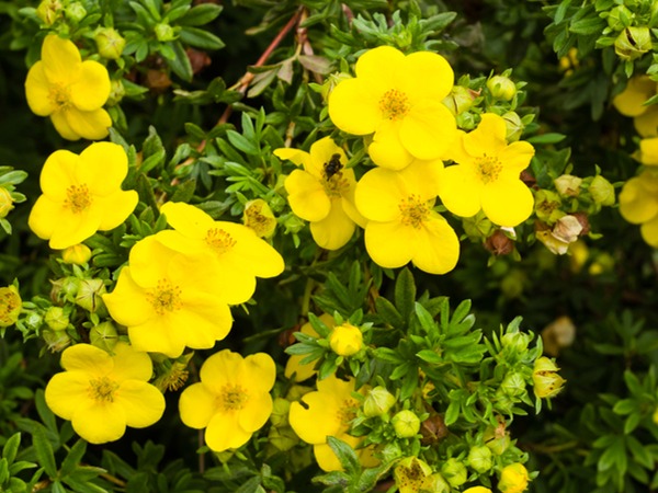 Pięciornik krzewiasty GOLDFINGER to jedna z bardziej popularnych odmian krzewu liściastego z rodziny różowatych. Niewysoki, gęsty krzew, dorastający do 0,5 m wys. Swoją popularność zawdzięcza małym wymaganiom, obfitemu kwitnieniu oraz niewielkim rozmiarom. Pędy łukowato wzniesione, rozgałęziające się szeroko. Kora na starszych pędach postrzępiona, czerwonobrunatna. Liście szaro-zielone, pierzasto złożone, składające się z 5-7 obustronnie owłosionych bezogonkowych listków. Kwiaty wyrastające na końcach pędów, złoto-żółte, średniej wielkości, ok. 4 cm śr, bardzo jaskrawe, o promienistej koronie składającej się z 5 płatków. Kwitnie od czerwca do września. Jesienią liście przebarwiają się na brązowo, a na zimę opadają.