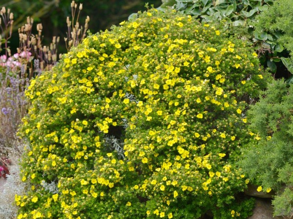 Pięciornik krzewiasty KOBOLD to jedna z bardziej popularnych odmian krzewu liściastego z rodziny różowatych. Niewysoki, gęsty krzew, dorastający do 0,5 m wys. Swoją popularność zawdzięcza małym wymaganiom, obfitemu kwitnieniu oraz niewielkim rozmiarom. Pędy łukowato wzniesione, rozgałęziające się szeroko. Kora na starszych pędach postrzępiona, czerwonobrunatna. Liście szaro-zielone, pierzasto złożone, składające się z 5-7 obustronnie owłosionych bezogonkowych listków. Kwiaty wyrastające na końcach pędów, złoto-żółte, średniej wielkości, ok. 4 cm śr, bardzo jaskrawe, o promienistej koronie składającej się z 5 płatków. Kwitnie od czerwca do września. Jesienią liście przebarwiają się na brązowo, a na zimę opadają.