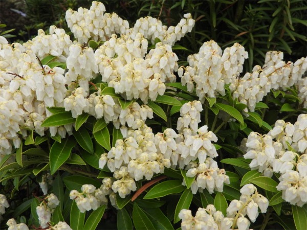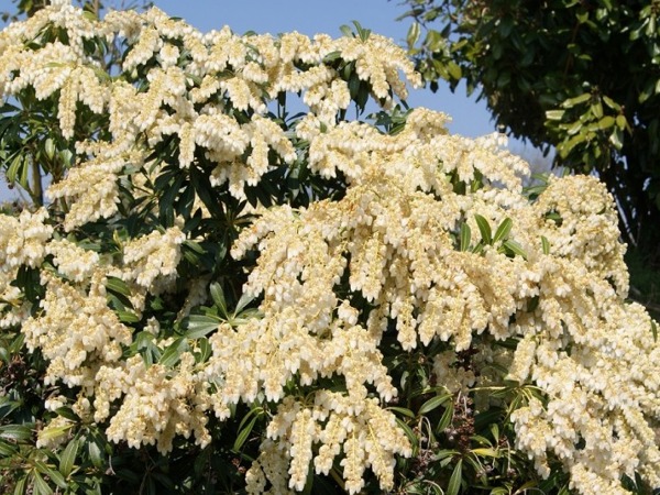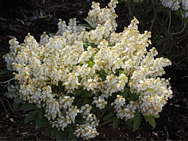 Pieris japoński DEBUTANTE to odmiana o egzotycznym wyglądzie i bardzo obfitym kwitnieniu, dorastająca do 1 m wysokości. Kwiaty białe, dzwonkowate, zwisające. Kwiatostany zawiązują się już jesienią, dlatego warto go na zimę okrywać. Rozwijają się bardzo wcześnie, czasem już pod koniec marca i w kwietniu. Wiechy kwiatów wznoszą się ponad liście.