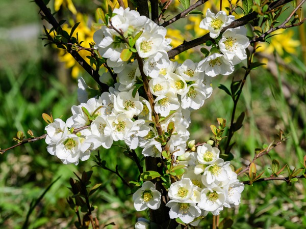 • Krzewy pigwowca pośredniego bardzo łatwo się zagęszczają, a posadzone obok siebie będą tworzyły zwarty, nieformowany, kolczasty żywopłot, który wczesną wiosną obsypie się kwiatami, a jesienią żółtymi owocami.