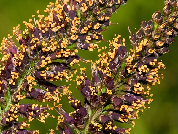 Kwiaty o charakterystycznym zapachu, drobne, obupłciowe, purpurowofioletowe z żółtymi pylnikami, zebrane w gęste, wyprostowane grona skupione po kilka na końcach pędów. Roślina miododajna, kwitnie w pierwszej połowie czerwca, dostarcza pszczołom nektaru i pyłku.