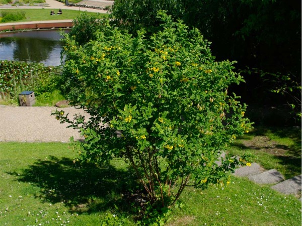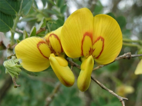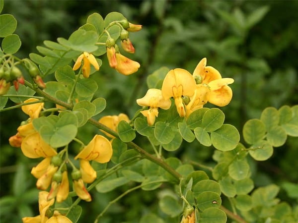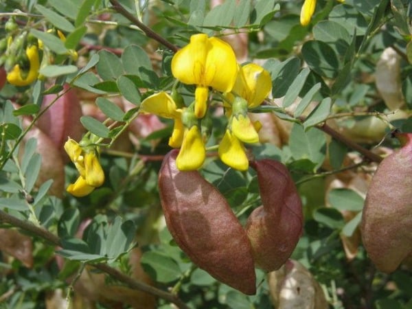 Kwiaty obupłciowe, zebrane w grona po 3-8 sztuk. Kwiaty motylkowe, żółte z czerwonobrązową plamką na żagielku. Liście złożone, długości do 13 cm, o 3-6 parach całobrzegich listków. Owocem jest duży, błoniasty i rozdęty strąk o długości 6-8 cm, pękający z trzaskiem przy naciśnięciu. Wymagania glebowe bardzo małe, odporny na suszę.