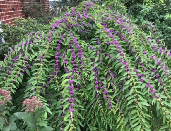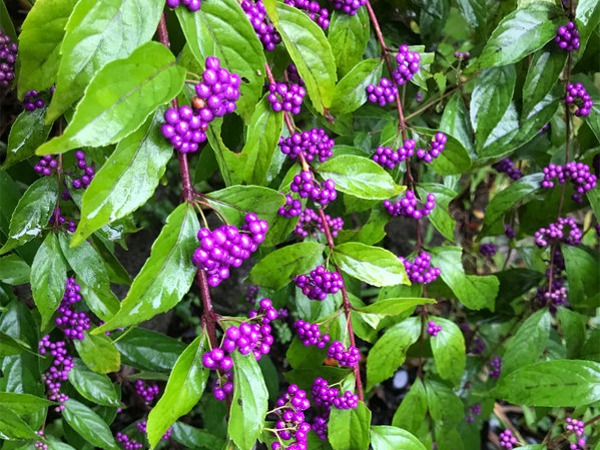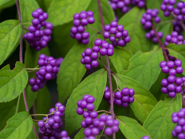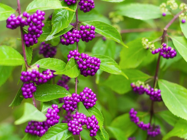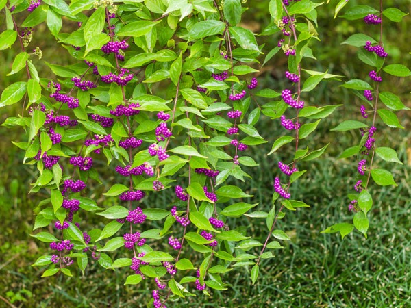 W sierpniu, na krzewie, pojawiają się niewielkie różowoliliowe kwiatostany. Kwiaty złożone są z płatków i 5 mm długości pręcików zwieńczonych żółtymi woreczkami pyłkowymi. Purpurowofioletowe, kuliste owoce dojrzewają we wrześniu i październiku. Owoce mają 3-4 mm średnicy i są zebrane w krótkie, wierzchotkowate grona po10-20 sztuk, które są równomiernie rozmieszczone na gałązkach. Średnica pojedynczego owocu wynosi ok.2 mm. Owoce utrzymują się jeszcze przez pewien czas po opadnięciu liści, aż do przymrozków.