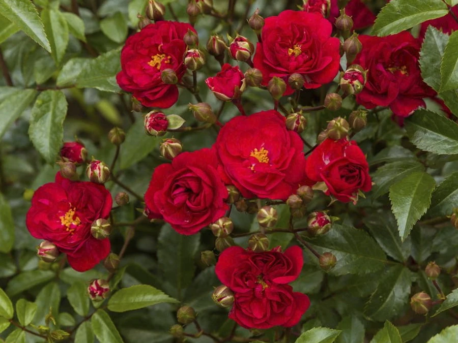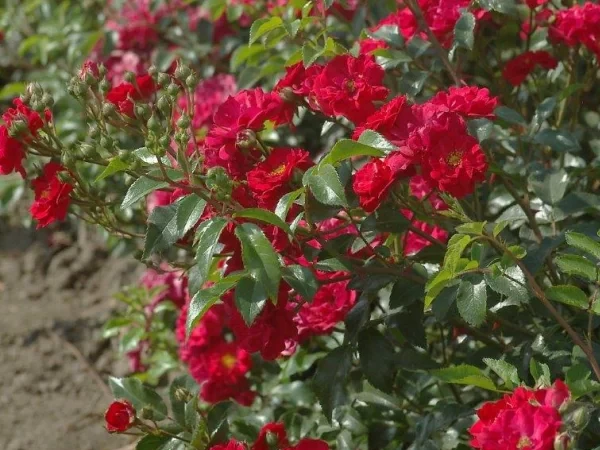 Swą popularność zawdzięcza min. łatwości w uprawie i wysokiej odporności na mróz (do -30 st.C). Pędy są cienkie, giętkie i pokryte licznymi cierniami. Liście małe, złożone z 5-7 listków, ciemnozielone i błyszczące. Kwiaty drobne, czerwone, pełne, o średnicy około 3-4 cm, zebrane w duże kwiatostany. Kwitnienie jest bardzo obfite i trwa od czerwca do późnej jesieni. Roślina nie wymaga cięcia wiosną. Jedynym zabiegiem, o którym należy pamiętać, jest usuwanie pędów martwych lub uszkodzonych.