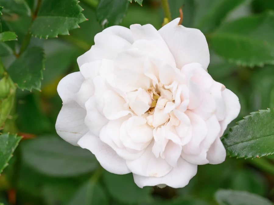 Swą popularność zawdzięcza min. łatwości w uprawie. Jest to niewysoki krzew dorastający do około 50 cm wysokości i podobnej szerokości. Pędy są cienkie, giętkie i pokryte licznymi cierniami. Liście małe, złożone z 5-7 listków, ciemnozielone i błyszczące. Kwiaty drobne, pełne, o średnicy około 3-4 cm, zebrane w duże kwiatostany. Kolor kwiatów biały. Kwitnienie jest bardzo obfite i trwa od czerwca do późnej jesieni. Po przekwitnięciu pojawiają się niewielkie, kuliste owoce (szypułki), które dodają roślinie uroku.