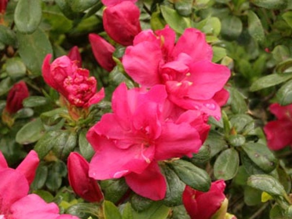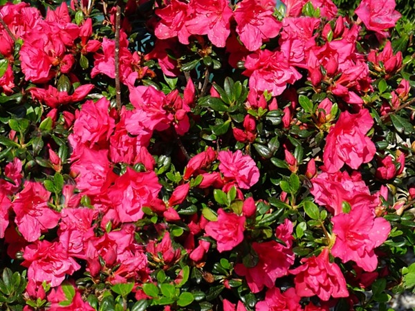 Azalia japońska TORNELLA to niewielki krzew o zwartym, poduszkowatym pokroju dorastający do 40 cm wysokości i 80 cm szerokości. Liście ciemnozielone, z wierzchu błyszczące. Kwiaty półpełne, karminowo-różowe z ciemniejszym, czerwonym rysunkiem w środku, 4 cm średnicy, zebrane po 3-4 sztuki w wierzchołkowe kwiatostany. Kwitnie bardzo obficie pod koniec maja.