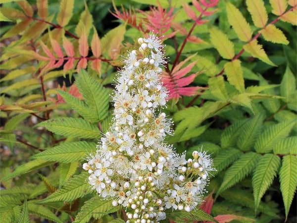 Kwiaty średnicy około 8 mm, zebrane na końcach pędów w duże, gęste, stożkowate wiechy, długości do 25 cm. Liście złożone z 13-23 lancetowatych, zaostrzonych, podwójnie piłkowanych listków. Młode listki są intensywnie różowo-pomarańczowe, starsze żółte, a położone wewnątrz krzewu jasnozielone. Należy do krzewów najwcześniej rozwijających liście na wiosnę. Niewybredna co do gleby. Rośnie dobrze zarówno na stanowiskach słonecznych, jak i ocienionych.